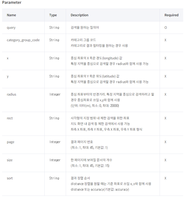 이제 파라미터인데 query만 필수이므로 query는 필수적으로 넣어주고, 여기서 나는 category_group_code, x, y, radius만 사용할 예정이다. (category_group_code에서 FD6값은 API 정보에 음식점이라는 정보라고 나와있음)
