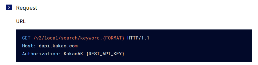 보면 Authorization 헤더에 KakaoAK (한 칸 띄고) (API 키) 임을 나타낸다.