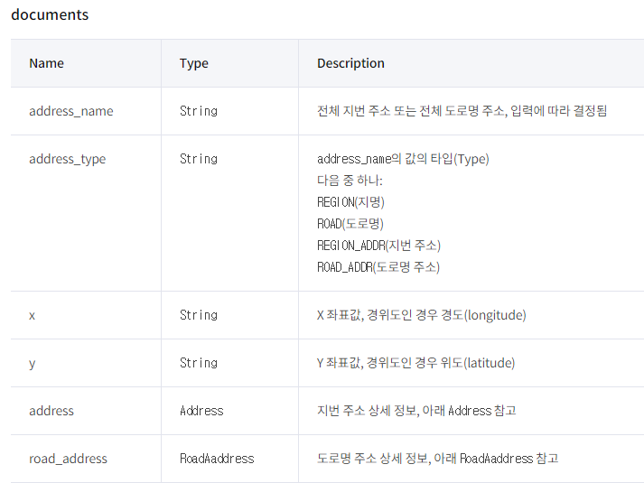 근데 여기서 나는 address_name과 x, y값만 필요하므로, 응답 DTO를 다음과 같이 만들었다.