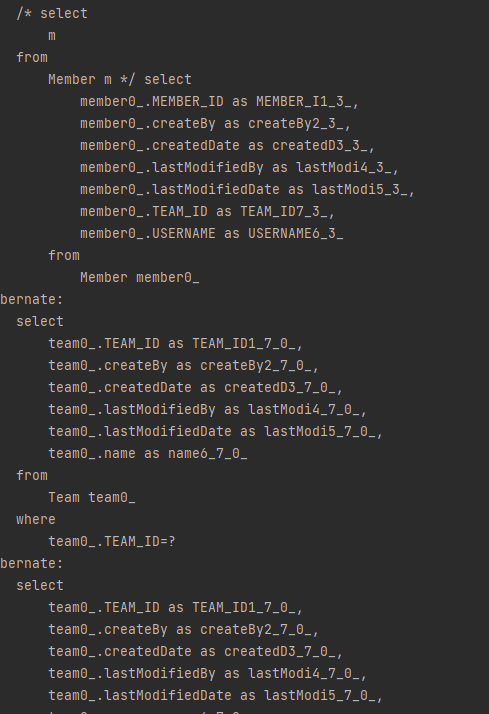 보면 member만 조회하는 select문만 나가야하는데, 보면 member 수가 2명 이기에 2명의 각 팀에 대한 쿼리 2개가 더 나갔다. 그래서 이를 N+1 문제라고 한다.