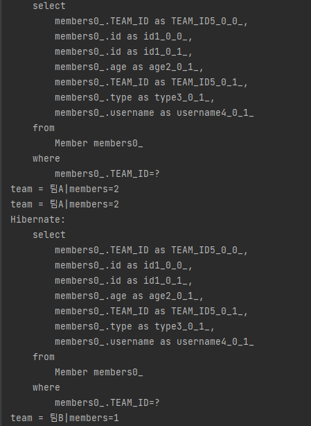 이렇게 member 중 팀들의 수 만큼 쿼리문이 나가는 것을 알 수 있다.