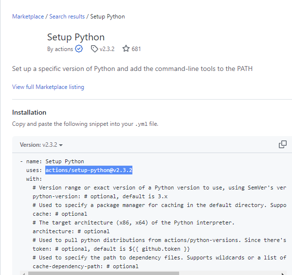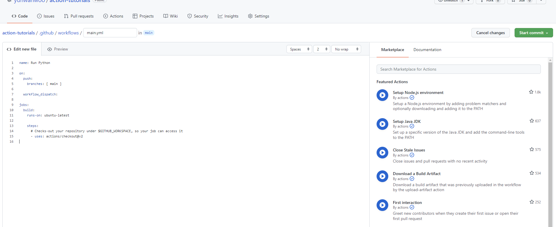 python을 가상 머신에 다운받고, 코드를 실행한다. python을 다운 받으려면 actions/checkout@v2처럼 작성해야 하는데 하는 법은