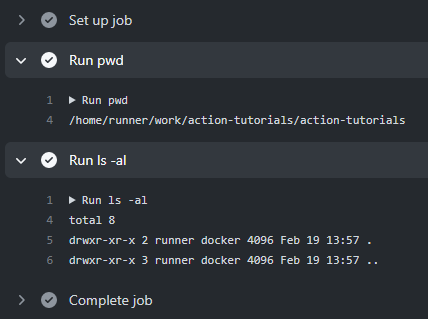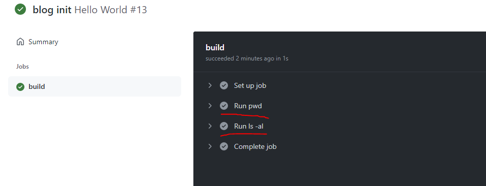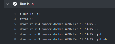 현재 디렉토리 파일들을 확인했을 때, .github 폴더 조차 보이지 않는다는 것이다. 이 것은 가상 머신에 내 코드를 아직 옮기지 않아서이다. 이를 위해서 actions/checkout@v2라는 기능을 추가해준다. 무슨 뜬금없는 코드냐고 생각할 수 있는데 github는 다양한 action들의 기능을 제공해준다.