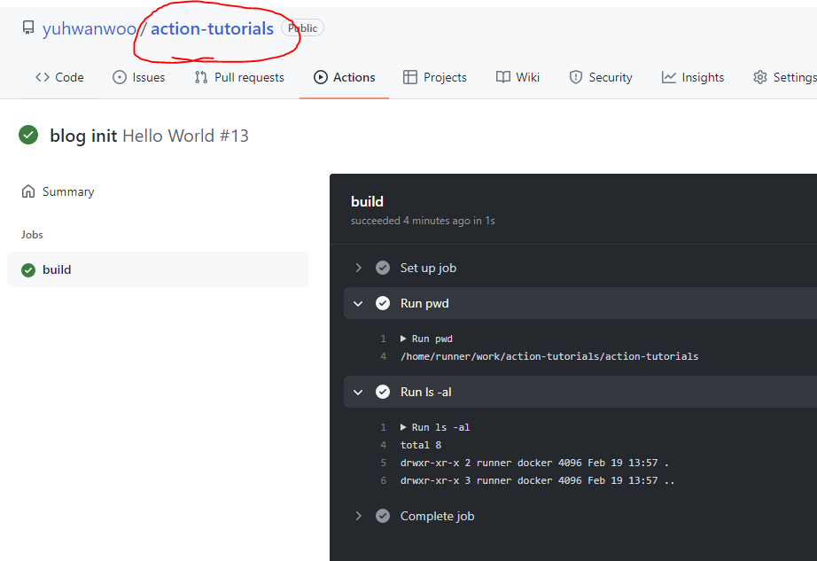 다시 우리가 작업하는 곳에 actions/checkout@v2를 추가해서 확인한다.