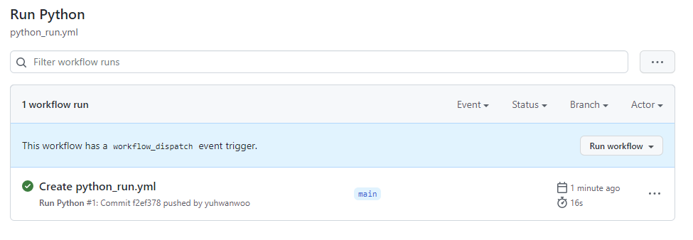 여기까지는 기초인데, 제공하는 option들이 많다. 예를 들어 코드에 동작방식으로 workflow_dispatch도 추가했는데, 이는 수동으로 작동한다.