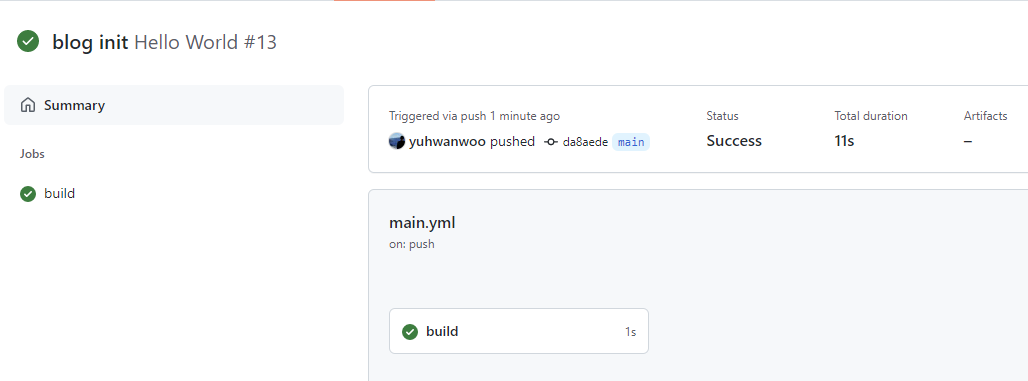 workflow 이름은 Hello World이고 내가 푸쉬한 커밋메시지가 적용됐다.