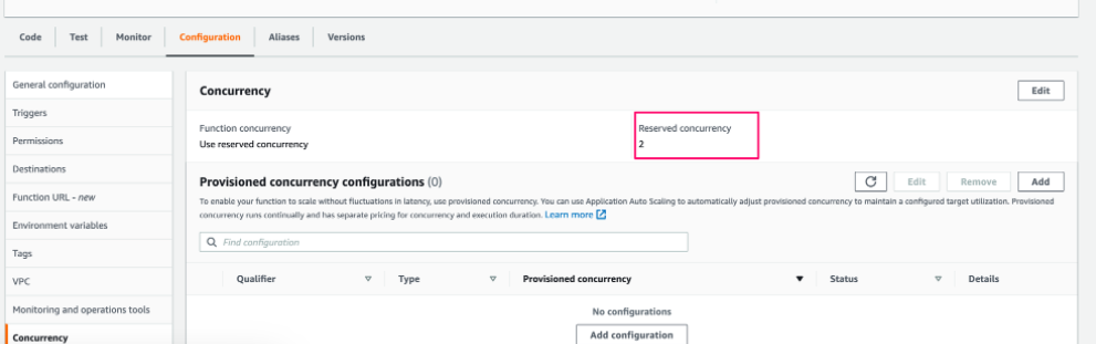 람다 함수의 설정을 보면(사진 참조) Reserved concurrency 값을 늘립니다.