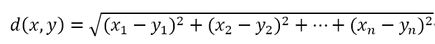 여기서 구하는 거리는 유클리디언 거리 혹은 L2 거리 라고 불리며, n차원 공간에서 두 점 사이의 최단 거리를 구하는 접근법.
