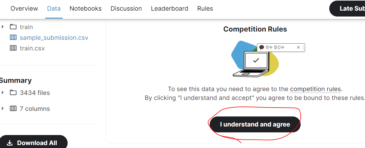 403 - Forbidden이 발생하는 경우입니다. 이 경우에는 각 데이터 셋에 data에 들어가 I agree를 클릭해서 다시 명령어를 입력하면 됩니다.