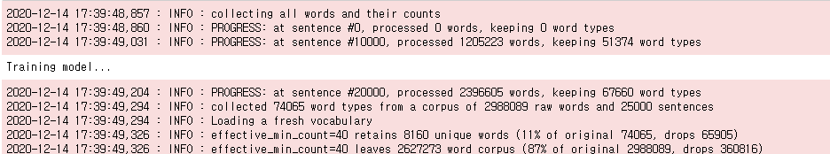 학습이 진행되며 로그 메시지가 나타나고 학습이 완료된다. 그 후 word2vec으로 학습시킨 모델의 경의 모델을 따로 저장하여 이후에 다시 사용하도록 한다.
